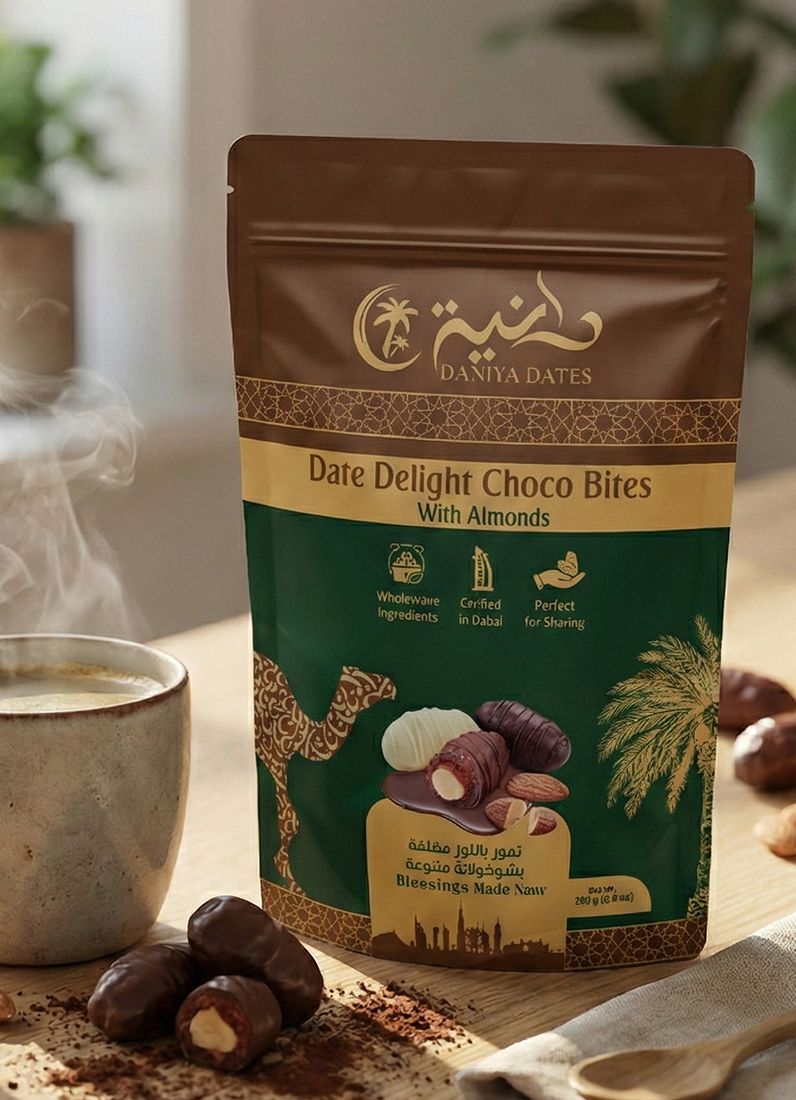 Indulge in Daniya Date Delight Choco Bites with Almonds (100 & 250g), the perfect sweet, nutty holiday treat.