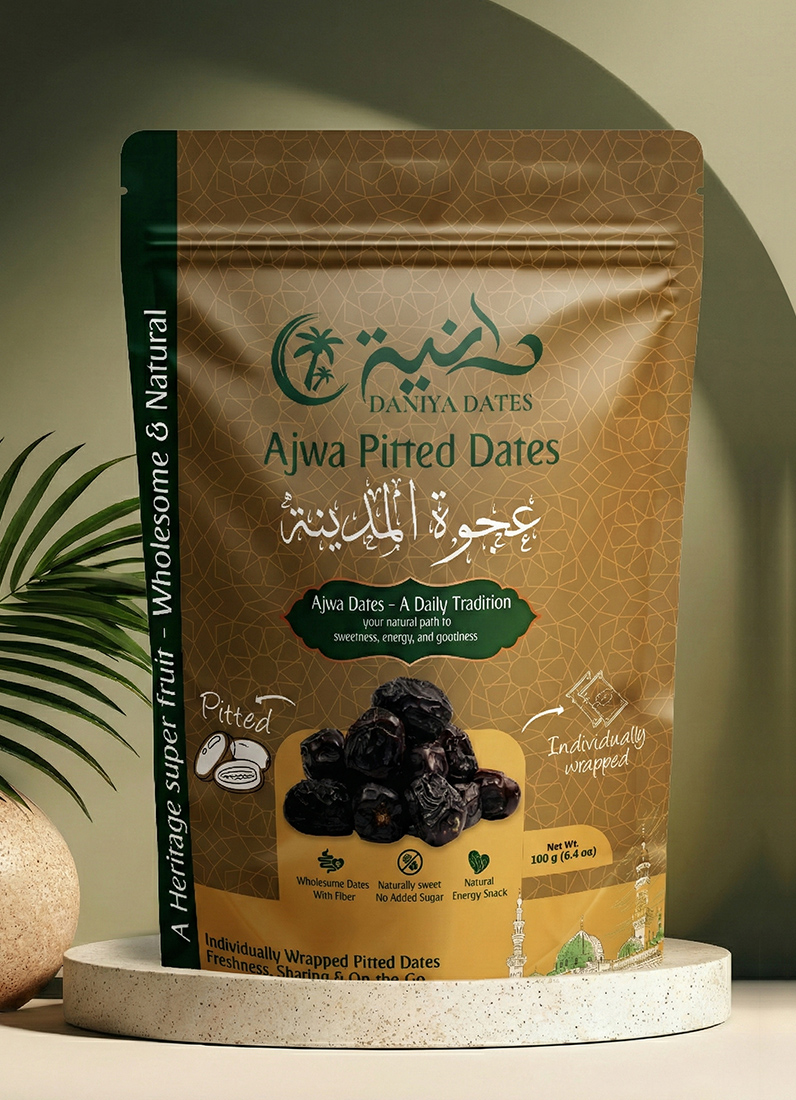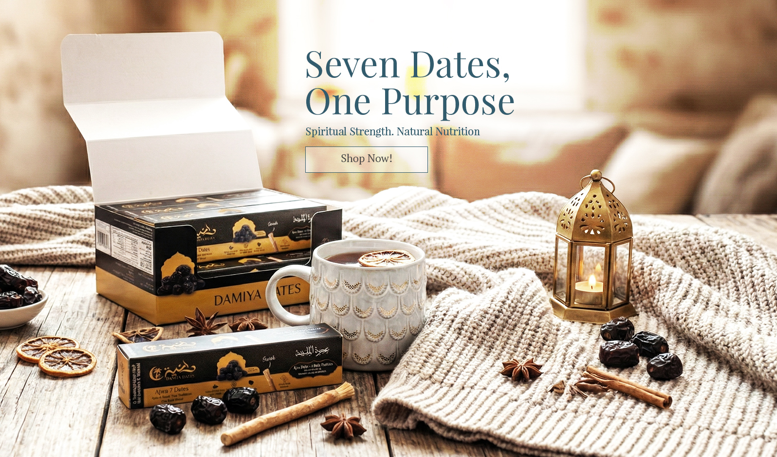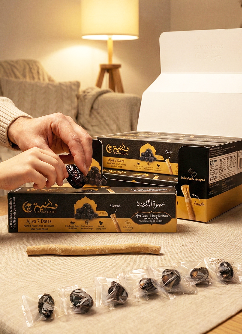 Experience seven Premium Ajwa dates paired with a Sunnah Siwak stick, embracing the Prophetic tradition of daily protection, purity, and natural wellness. Naturally sweet, rich in fiber, and free from added sugar.