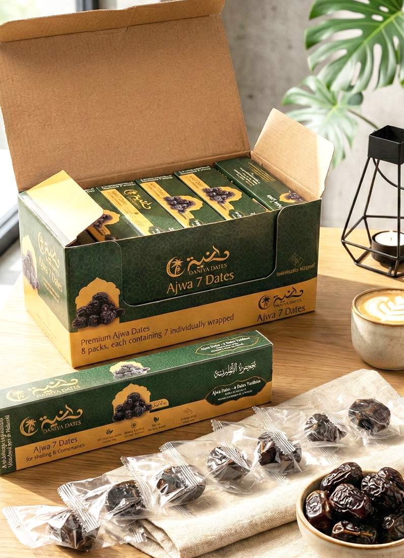 Eight packs of 7 small, semi-dry Ajwa dates with tender chew and earthy sweetness, individually wrapped for maximum freshness and easy daily consumption.